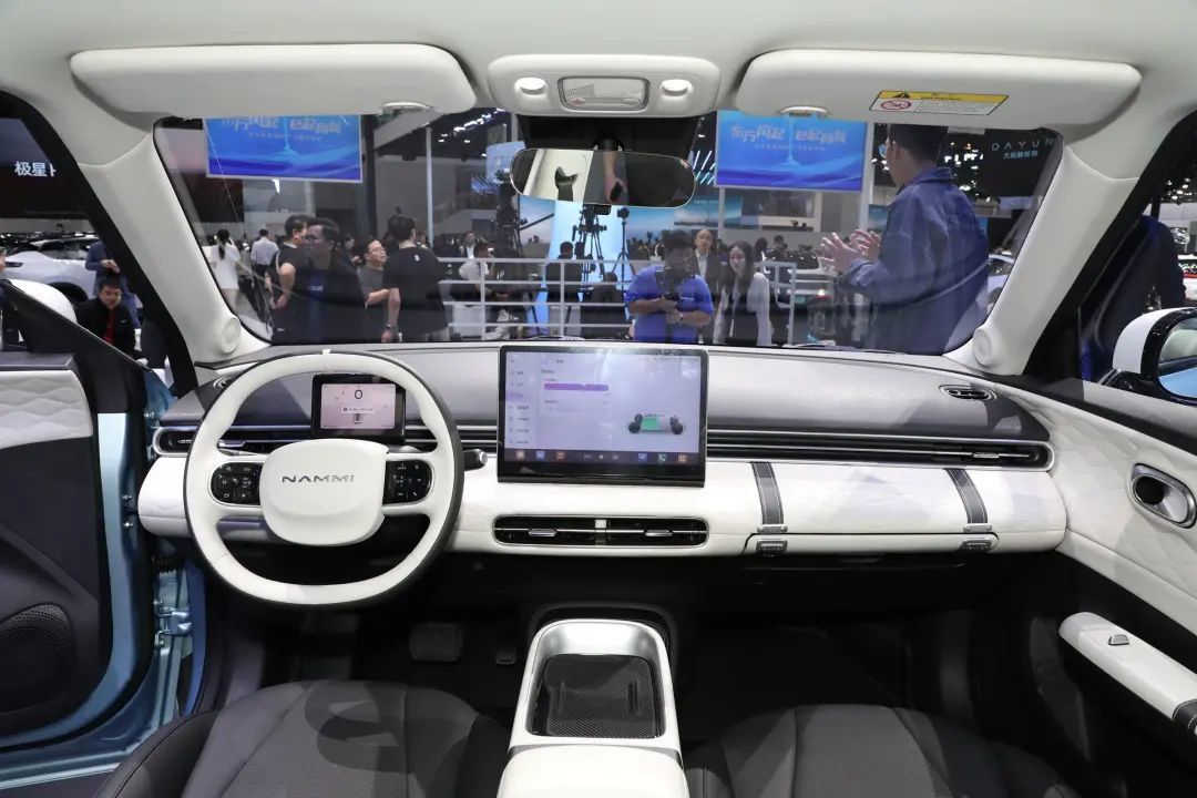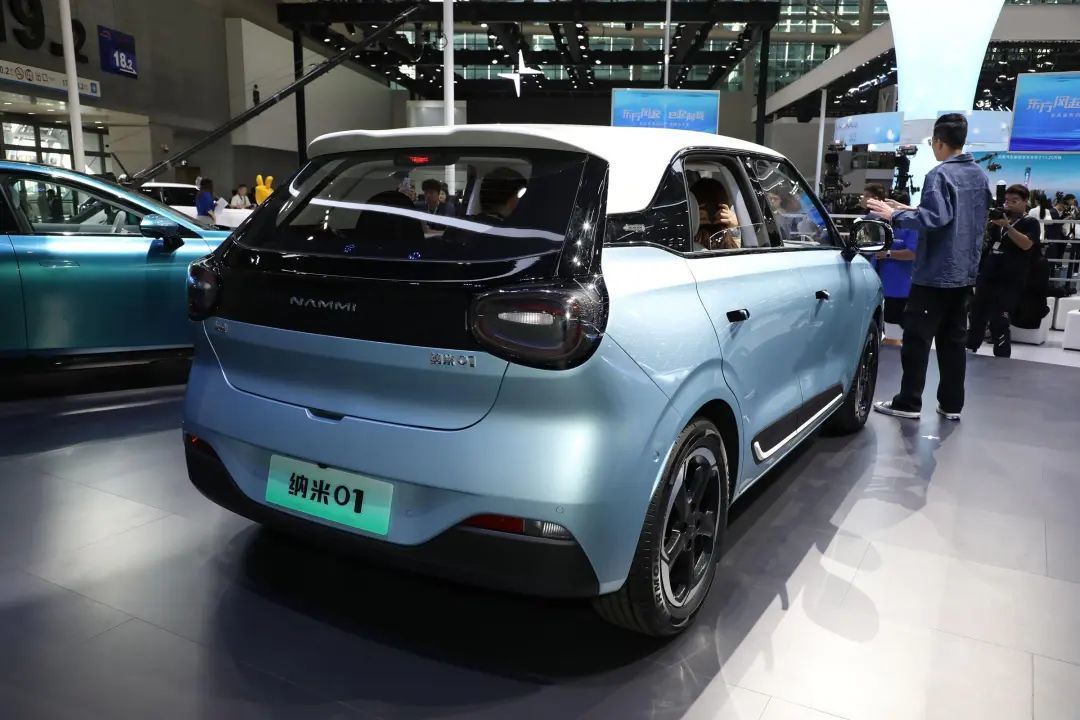 车身侧面,新车线条流畅,车顶营造出悬浮式视觉效果,并采用与车身不同的颜色设计。此外,新车还配备隐藏式门把手以及无框式车门设计,充电接口位于右前翼子板处,门板下方设计了装饰面板,搭配下方五辐式造型轮辋,提升车辆视觉层次感。车尾部分,新车尾灯造型小巧并通过黑色装饰面板相连,中间则是纳米品牌“NAMMI”的英文字母LOGO“,进一步提升车辆的辨识度。