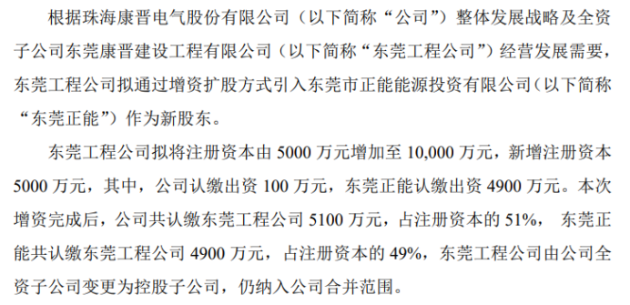挖贝网1月8日,康晋电气(873863)近日发布公告,根据珠海康晋电气股份有限公司(以下简称“公司”)整体发展战略及全资子公司东莞康晋建设工程有限公司(以下简称“东莞工程公司”)经营发展需要,东莞工程公司拟通过增资扩股方式引入东莞市正能能源投资有限公司(以下简称“东莞正能”)作为新股东。