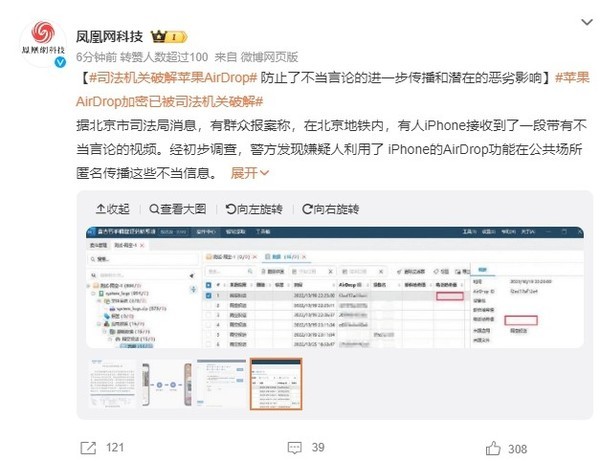 【手机中国新闻】1月9日,手机中国了解到,据北京市司法局消息,在北京地铁内,有人iPhone接收到了一段带有不当言论的视频。经初步调查,警方发现嫌疑人利用了 iPhone的AirDrop(隔空投送)功能在公共场所匿名传播这些不当信息。由于AirDrop的匿名性和追踪难度,已经有部分网民开始效仿这种行为,因此,需尽快找出发送源并确定其身份,以避免恶劣影响。