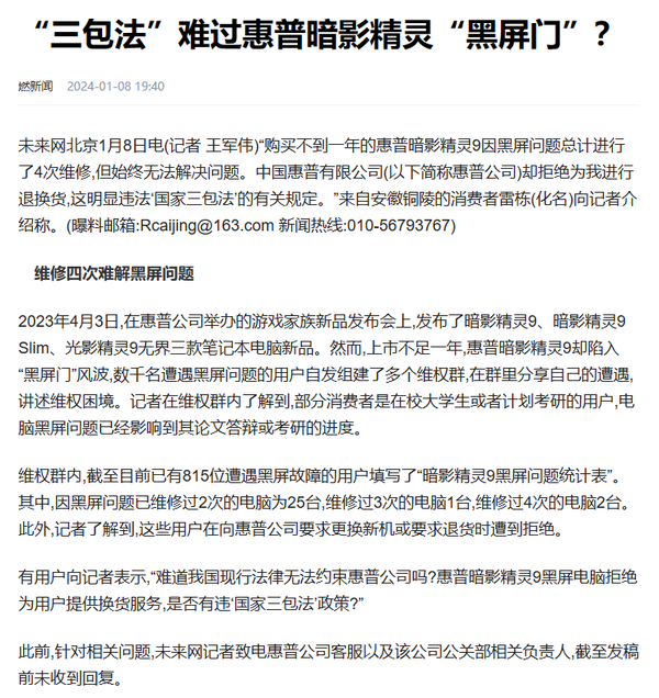 据统计,截至目前,已有815位遭遇黑屏故障的用户填写了“暗影精灵9黑屏问题统计表”。其中,因黑屏问题已维修过2次的电脑为25台,维修过3次的电脑1台,维修过4次的电脑2台。此外,记者了解到,这些用户在向惠普公司要求更换新机或要求退货时遭到拒绝。有消费者提出质疑,认为黑屏问题始终无法解决,又不肯退货换货的惠普明显违反“国家三包法”的有关规定。