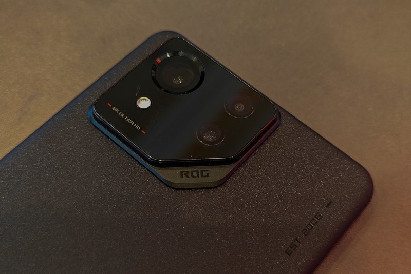 从现场真机可见,ROG游戏手机8系列背面设计更为简洁,没有之前电竞游戏手机的棱角分明的线条,整体显得圆润不少。尤其是摄影模组从ROG游戏手机标志性的横排长条改为了阶梯式的五边形,“ROG”的标识位于右下角,像是横卧时的抓手。