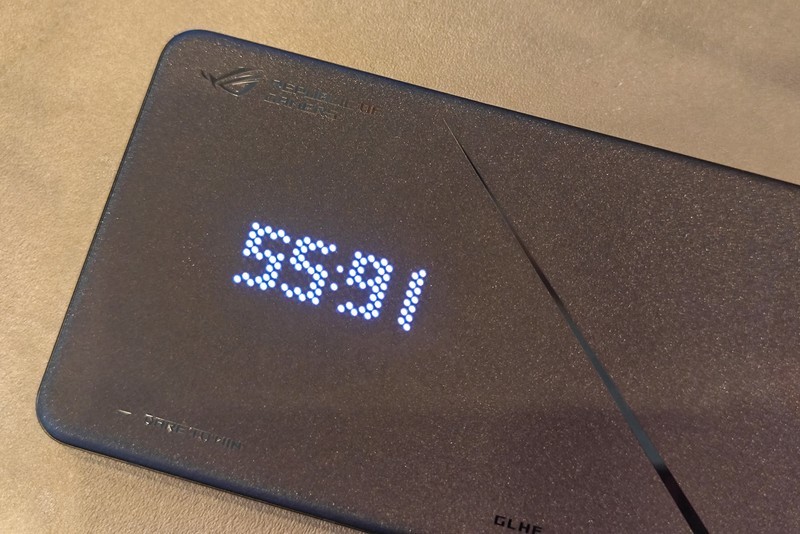当然,ROG必须要有光。ROG游戏手机8 Pro背面仍然有一个类似之前幻14、幻16笔记本的矩阵LED显示屏,从我们现场的体验来看,这块背面屏幕能显示电量、时间和ROG标志的信仰之眼,好像还能让用户设定不同的图案(动图),玩法相当多样。而如果不点亮屏幕,基本看不出有屏幕的存在,工艺相当精细。