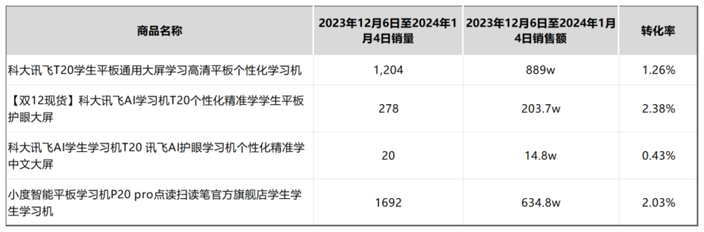 或许网易有道可推出如直播间免费体验、先体验、后付款方式等方式,解决线下渠道的短板。但目前大模型学习机的高售价,和抖音直播间追求低价完全是矛盾的,进而导致大模型学习机在抖音直播间转化率极低。如科大讯飞T20系列多款链接,以及小度平板学习机系列抖音直播间转化率不足3%。