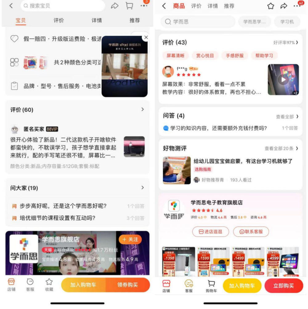 学而思XPad2 Pro系列学习机在天猫和京东官方旗舰店中评论量均不足百条、评论较少的背后,侧面反映出产品销量不佳。