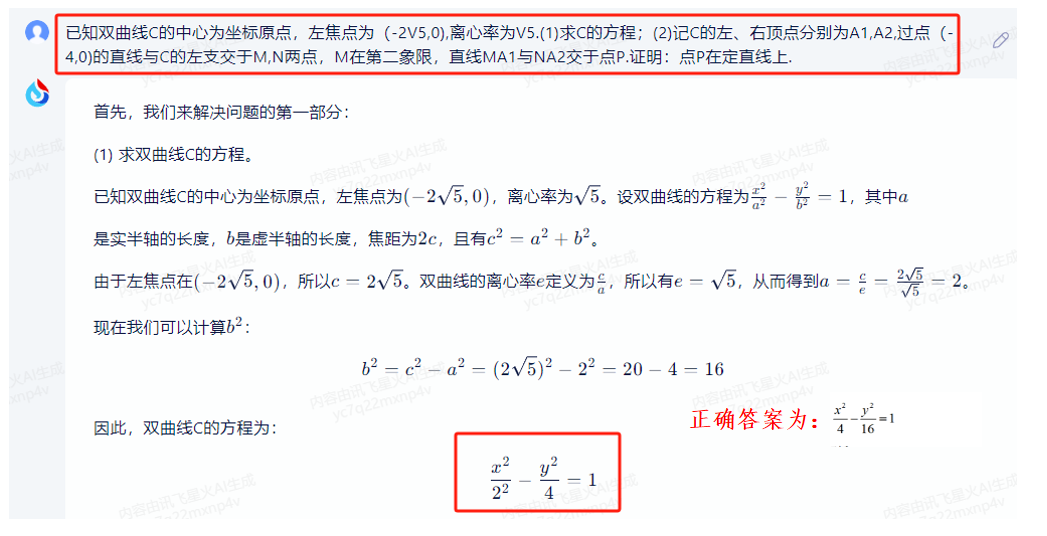 第二问中讯飞星火虽给出完整的解析过程,但其给出的点P始终在X=-2运动和正确答案点P始终在X=-1上运动相比,再次错误。屡屡出错下,又何谈让家长为大模型学习机买单呢?