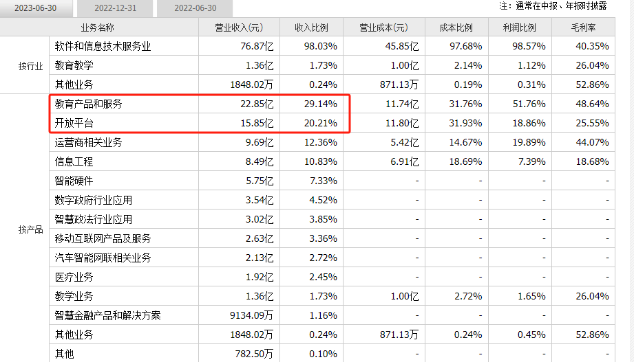 但科大讯飞2023年半年报显示,教育产品和服务、开放平台收入在科大讯飞总营收中合计占比接近50%,智能教育硬件逐渐支撑起科大讯飞的未来。