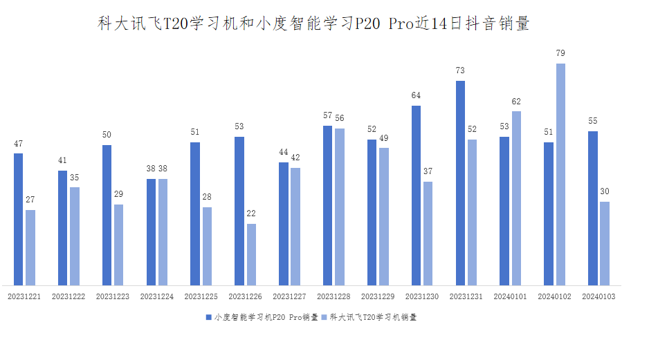 搭载文心一言大模型的小度智能学习机P20 Pro和科大讯飞T20学习机近14天在抖音平台,日均销量分别为52台和78台。换言之,大模型学习机在家长端仍处在低渗透阶段。