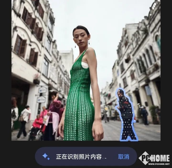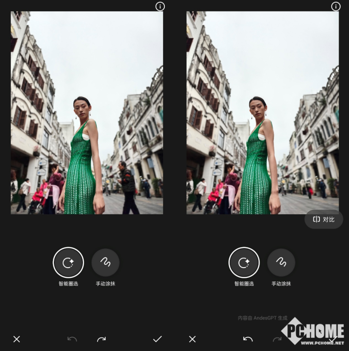 旅行时拍的游客照不想有过于抢眼的路人入镜,也可以使用AIGC消除功能。圈选路人的大概轮廓后,AIGC消除非常精准的识别到了人形,并且进行分割。而且消除路人并生成图像的速度也是非常迅速,几秒钟便生成了新的图像,耗时非常之短。通过对比图可以看到消除路人后画面填补为街道与建筑,虽然路人背包处的一点红色在画面上有所残留,不过并不明显。相比于消除前路人抢眼入镜,消除后的整体效果还是令人满意的。背景更为干净,涂抹感虽有,但是并不明显,保证了图像的精美度与质量,可以更为直接的关注到画面中的模特本身。