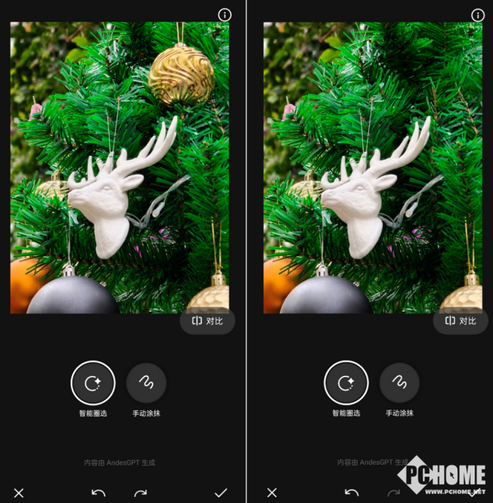 比如这张图笔者更想突出画面中间的鹿头挂饰,圈选后方的灯球挂饰后,灯球挂饰消除的同时,画面补充为周边的绿叶。相比于传统基于计算机视觉的消除,拥有大模型能力的AIGC消除功能对消除后空白区域拥有补全能力。