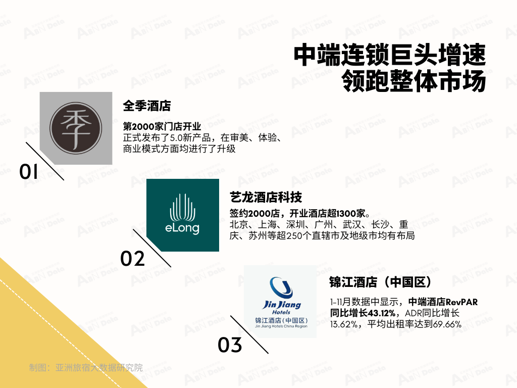 中端连锁巨头增速领跑整体市场|在2023年年末,中端连锁酒店市场接连交出高增速的发展业绩。首先是进入千店新周期的全季酒店,其在11月达到第2000家门店的里程碑,并在本月正式发布了5.0新产品,在审美、体验、商业模式方面均进行了升级。其二,仅成立2年的艺龙酒店科技也迎来签约2000店的里程碑,同时开业酒店超1300家,艺龙会会员规模超过1500万。北京、上海、深圳、广州、武汉、长沙、重庆、苏州等超250个直辖市及地级市均有布局。以中端、中高端为主的艺龙酒店科技平台旗下已经形成了十几个酒店品牌体系,包含美豪丽致酒店、廷泊酒店、艺龙电竞酒店、美豪酒店、莫林酒店、艺选安來酒店、艺选酒店等品牌。此外在整体运营情况的增速上,锦江酒店公布的1-11月数据中显示,中端酒店RevPAR同比增长43.12%,ADR同比增长13.62%,平均出租率达到69.66%。