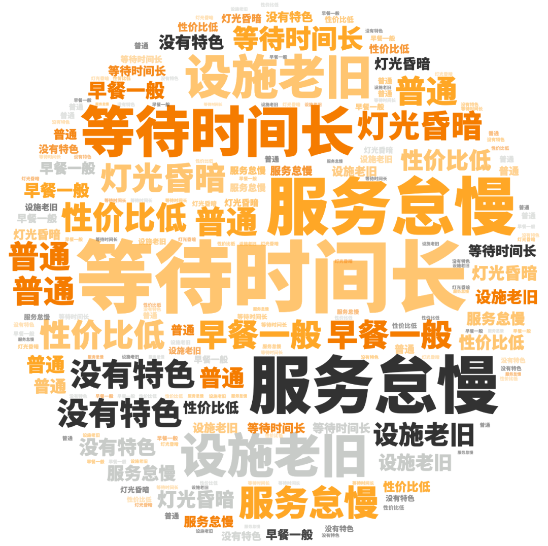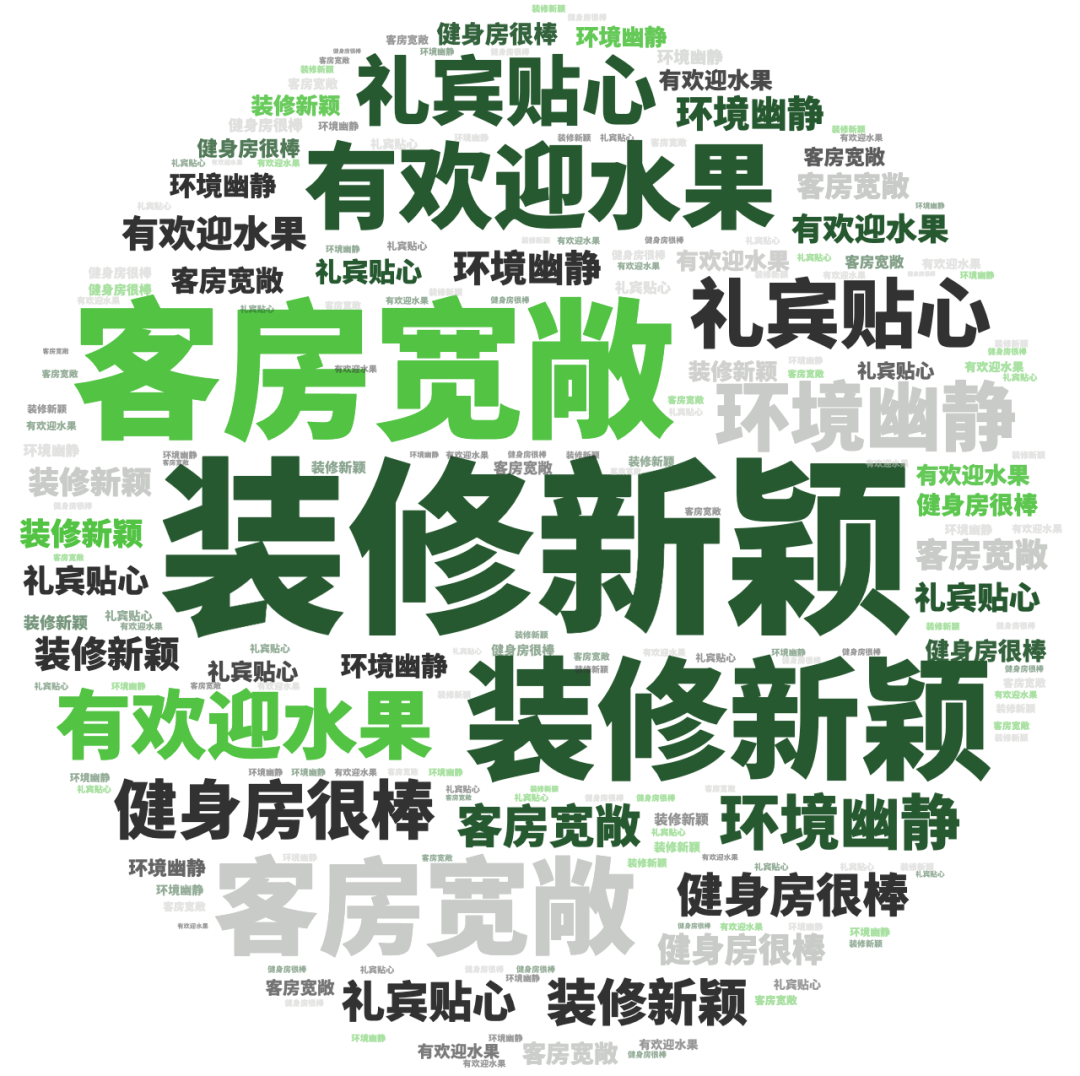 点评指数:点评指数平均得分为88.38,呈现持续小幅上升趋势,本月未有品牌拿到300分,好评维度平均是差评维度的1.21倍。好评关键词主要是设计有特点、床品舒服、视野好等,差评主要集中在设施老旧、服务怠慢、等待时间长等问题。