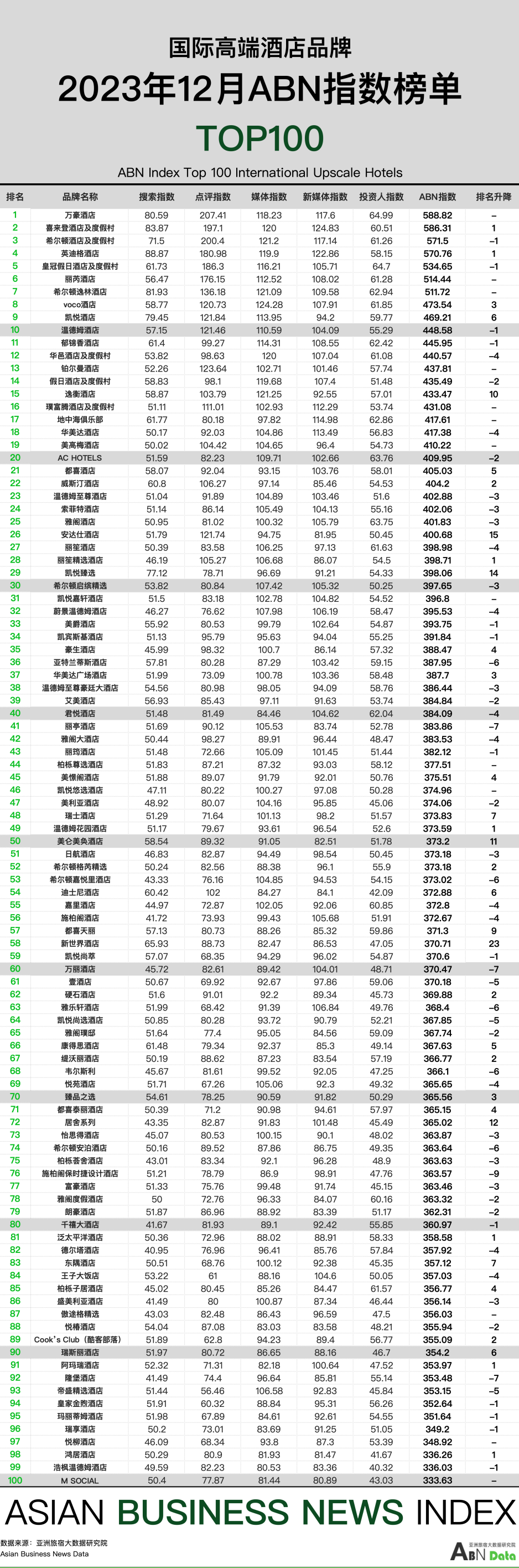 媒体指数:媒体指数保持平稳走势,主要得分集中在行业网站、门户网站和奢牌酒店官网的宣传上。头部品牌分值差距较小,主要是在节日主题活动和酒店特色餐饮上较为活跃,如四季酒店圣诞慈善亮灯活动、深圳瑞吉酒店推出"罗湖印象"居行套等。