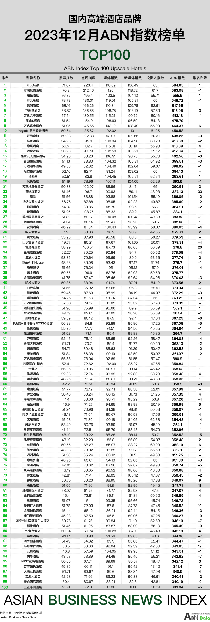 综述:2023年12月,中高端酒店的投资人指数保持高位水平,五个指数监测综合平均得分达到了396.14。