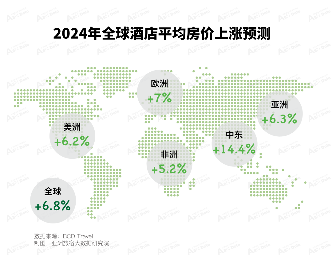 根据BCD Travel的数据显示,2024年全球酒店平均房价预计上涨 6.8%。其中,美国的ADR将同比增长4.3%,而加拿大和墨西哥将分别增长6.5%和8%。欧洲的ADR将同比增长7%,拉丁美洲将增长8.2%,亚洲将增长6.3%,非洲将增长5.2%,包括澳大利亚在内的西南太平洋地区将增长3.1%,中东地区的ADR将同比增长14.4%。