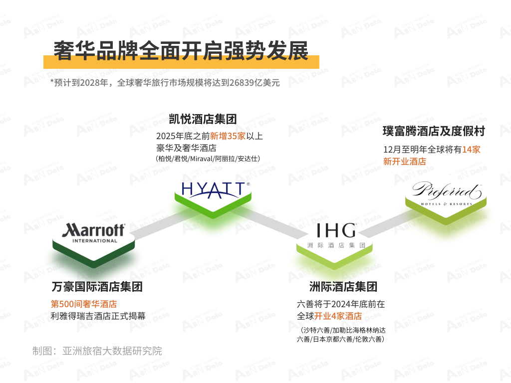 奢华品牌全面开启强势发展|12月,四大国际酒店集团纷纷公布了旗下奢华品牌组合的扩张计划,针对全球各地奢华旅行市场已全面开启强势进军。万豪国际集团宣布其第500间奢华酒店利雅得瑞吉酒店正式揭幕,标志着集团旗下奢华品牌在全球范围内的强势稳固发展。万豪国际集团旗下奢华品牌酒店现已覆盖全球69个国家及地区。未来,万豪国际集团还有200多间奢华酒店和度假村正在筹备中,其中24间计划于2024年开业。