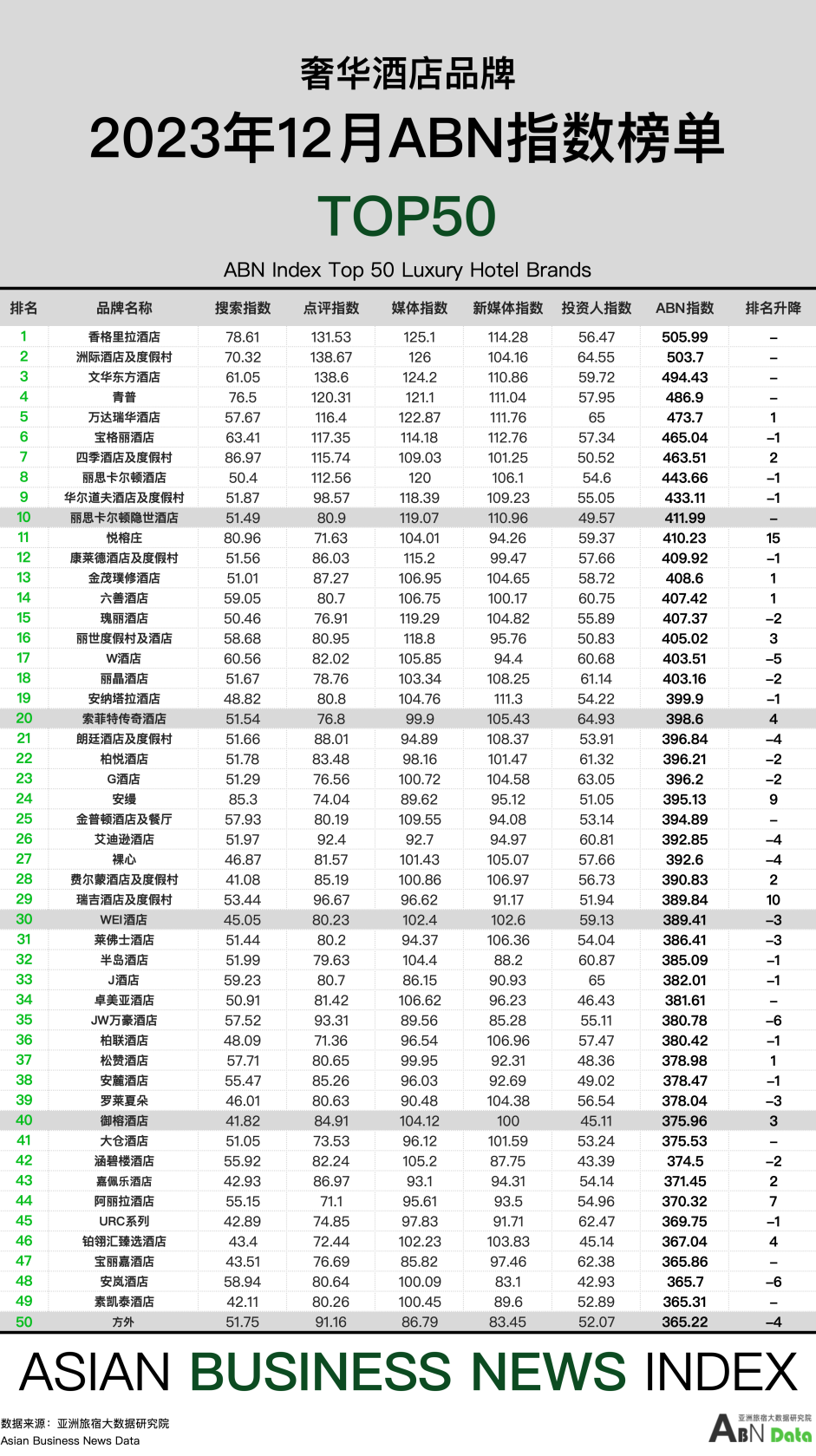 综述:2023年12月,奢华酒店的媒体指数和新媒体指数保持高位水平,五个指数监测综合平均得分达到403.38。