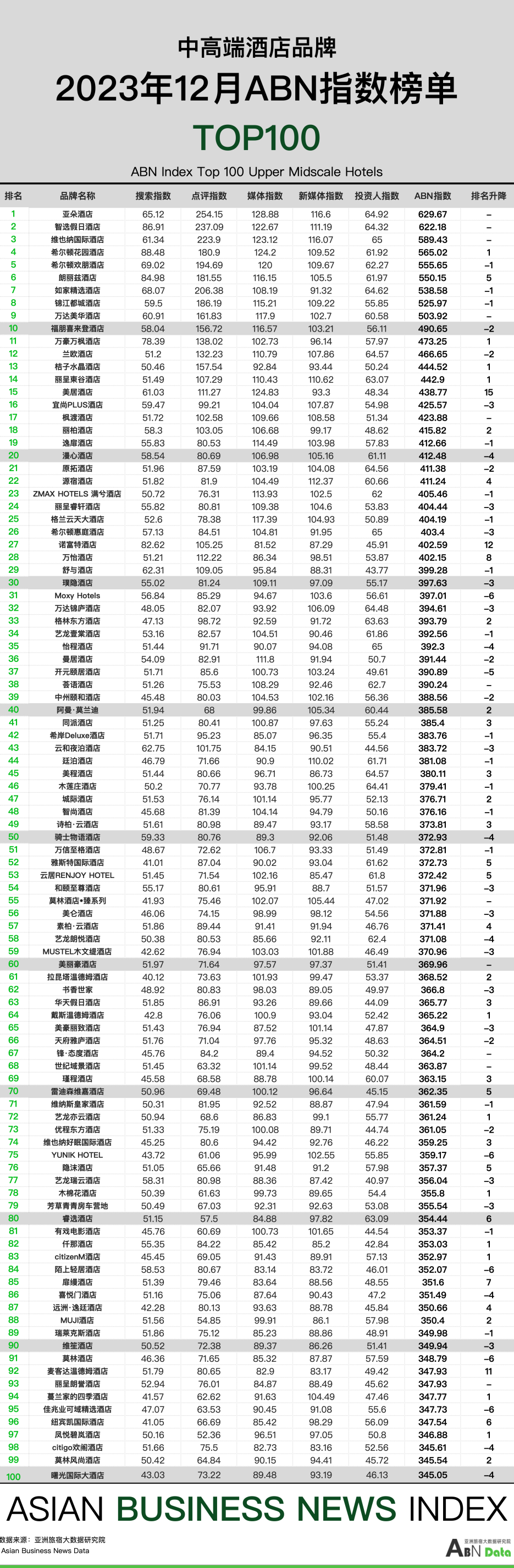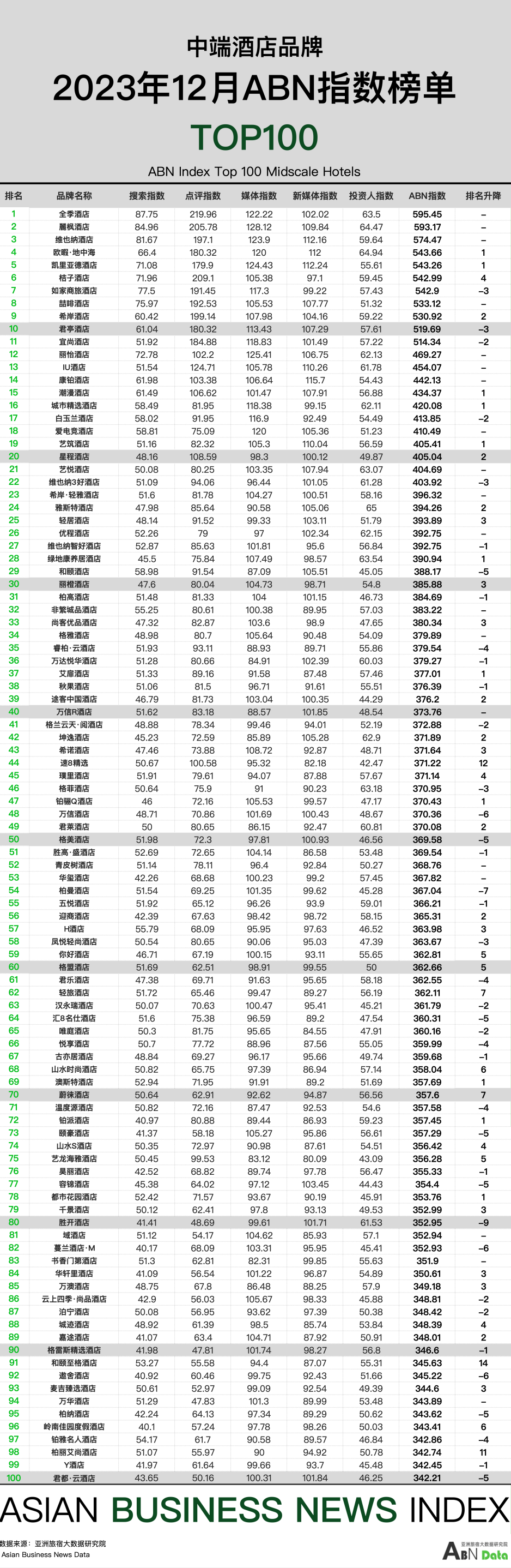 综述: 2023年12月,中端酒店的搜索和投资人指数居于高位,五个指数监测综合平均得分达到了390.79。
