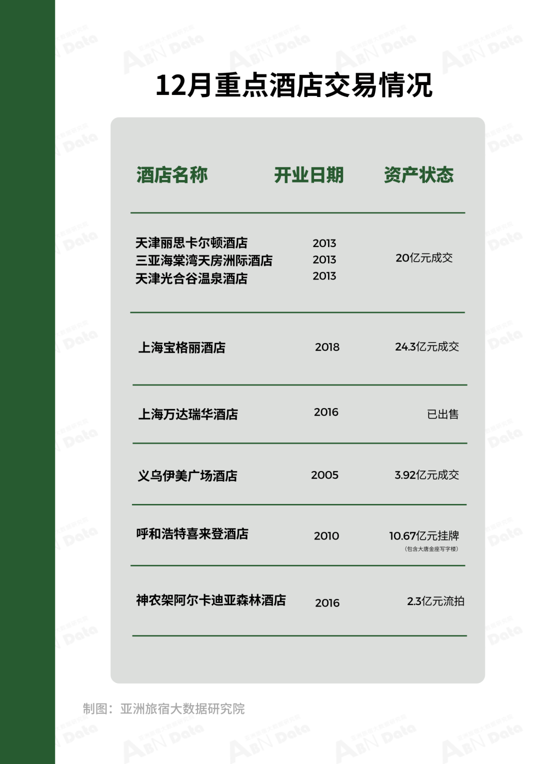 12月,ABN指数监测名录统计共有30家酒店资产处于出售、拍卖及流拍阶段,其中拍卖价格在亿元以上酒店有12家,环比出现小幅波动,且有4家酒店拍卖成交。酒店资产交易典型事件有:天津丽思卡尔顿酒店、三亚洲际酒店、光合谷温泉酒店合计以20亿元被售出;上海宝格丽酒店以24.3亿元被售出,购买方为江苏金峰水泥集团有限公司;上海万达瑞华酒店已被售出,由新加坡金鹰集团接盘;义乌伊美广场酒店以3.92亿元被售出;内蒙古大唐国际托克托发电有限责任公司以不低于10.67亿元挂牌旗下喜来登呼和浩特酒店等资产;荣盛发展旗下湖北神农架阿尔卡迪亚森林酒店法拍流拍 ,起拍价2.3亿元。