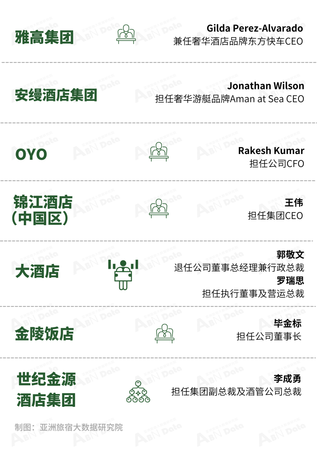 12月,酒店企业高管变动延续了2023年的态势,继续保持较高流动性。在国际酒店集团中,一是雅高集团任命其首席战略官Gilda Perez-Alvarado兼任奢华酒店品牌东方快车CEO,在10月,她才刚被任命为雅高集团首席战略官,直接向雅高集团董事长兼CEO Sébastien Bazin汇报。二是安缦酒店任命 Jonathan Wilson为集团旗下奢华游艇品牌Aman at Sea的首席执行官。Wilson将负责集团首只奢华超级游艇的开发和推出。三是OYO宣布任命Rakesh Kumar为公司的新CFO,现任CFO Abhishek Gupta将转为公司顾问的角色。