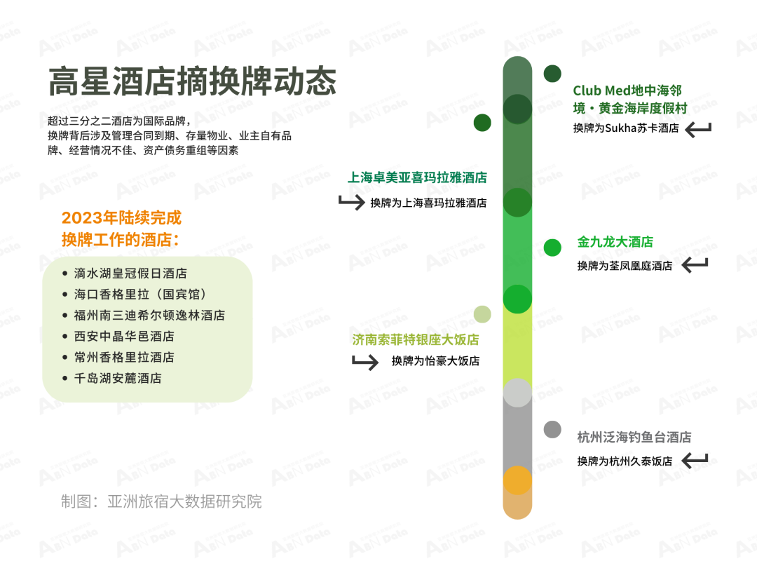2023年陆续完成换牌工作的还包括:滴水湖皇冠假日酒店、海口香格里拉(国宾馆)、福州南三迪希尔顿逸林酒店、西安中晶华邑酒店、常州香格里拉酒店、千岛湖安麓酒店等酒店。超过三分之二酒店为国际品牌,换牌背后的原因复杂多变,涉及管理合同到期、存量物业、业主自有品牌、经营情况不佳、资产债务重组等因素,预计这种市场趋势将会延续到2024年。