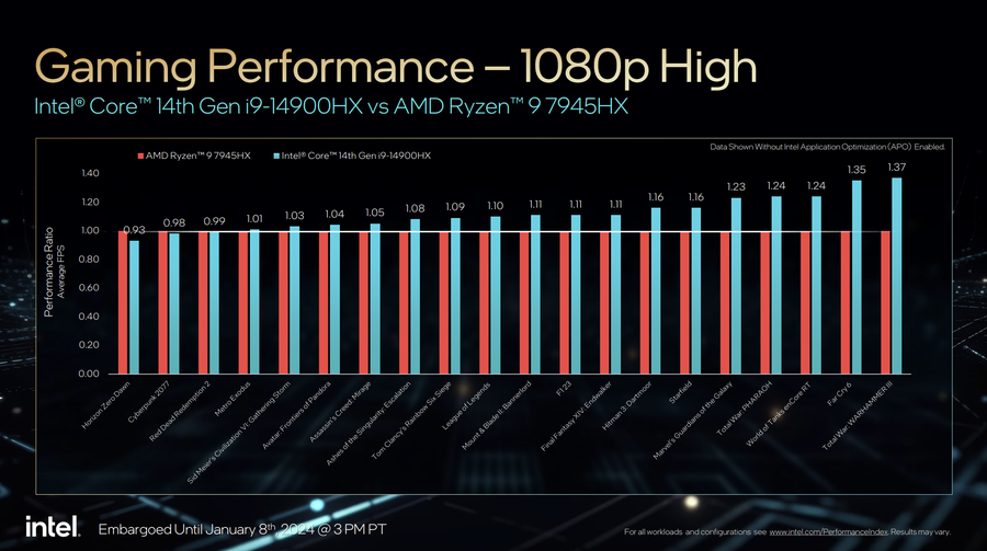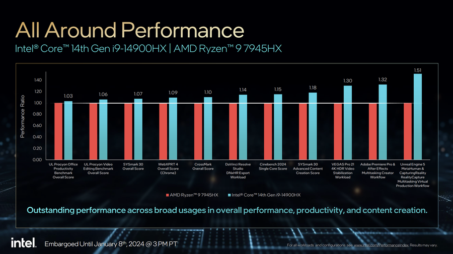 根据英特尔实验室的数据,对比竞品AMD锐龙9 7945HX,酷睿i9-14900HX无论游戏性能还是生产力性能,目前整体上依旧是领先的。