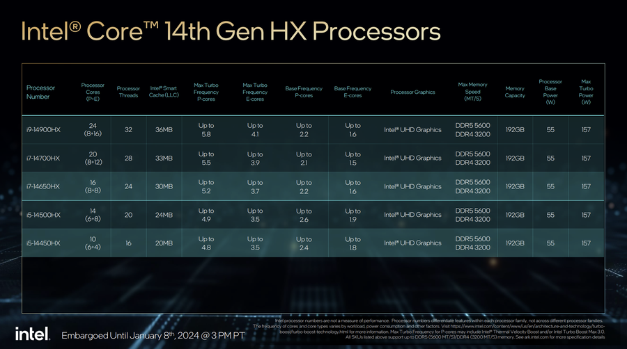 在目前进行的CES 2024上,英特尔正式发布了酷睿第14代HX系列移动处理器,共计5款型号,包括酷睿i9-14900HX、酷睿i7-14700HX、酷睿i7-14650HX、酷睿i5-14500HX、酷睿i5-14450HX。这些新处理器将应用在游戏本以及创作本等高性能移动PC上。