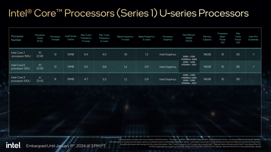 搭载英特尔酷睿U处理器1系列的笔记本电脑将在2024年第1季度上市。