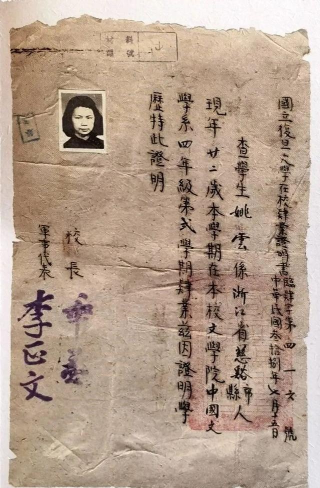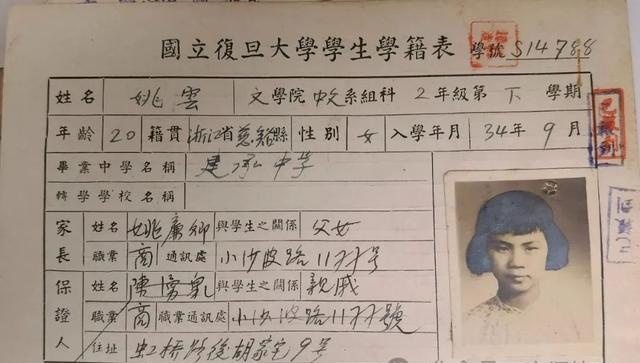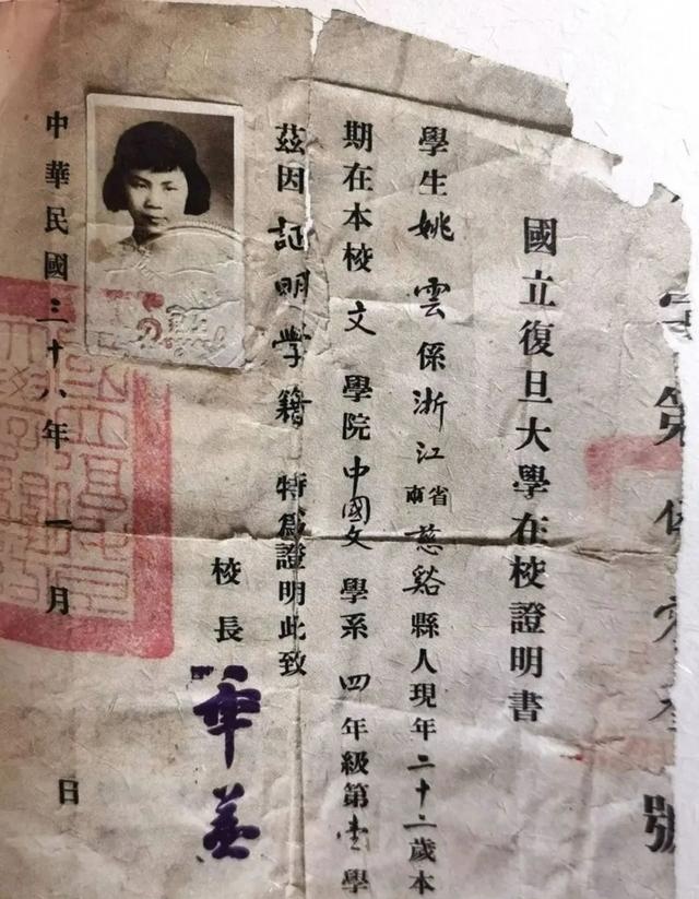1945年秋,姚云从上海建承中学毕业,有两位同学拉她去报考圣约翰大学,“我虽然英文差,没信心,也勉强去考了,结果三人都没有被录取(此校英文要求很高)。九月十五日,考私立复旦大学,我与顾雅珍、吴凤英三人同往,我投考中国文学系,十八日考其他科目,二十日揭晓。我和吴凤英被录取了”。档案里的《复旦大学新生报名存根》显示,姚云于当年9月15日到复旦应考,报名号数为20,报考院系是文学院中文系。《报名存根》还列出了她的考试成绩,在“取”或“不取”一栏里,划去了“不取”两字,表明她已被录取。