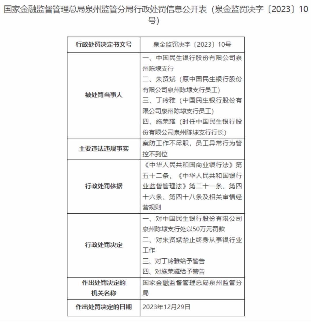 刚刚进入2024年之际,民生银行就迎来了相关部门的罚单,可谓开局不利。因为泉州陈埭支行存在“案防工作不尽职,员工异常行为管控不到位”的违法违规事实,国家金融监管总局福建监管局决定对民生银行泉州陈埭支行罚款50万元。