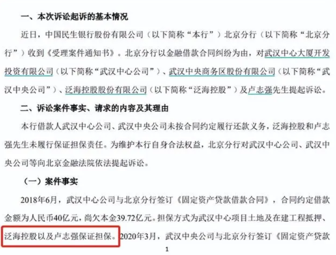 再之后就是民生冻结泛海控股股权,起诉卢志强,索赔金额超过70亿元。根据民生银行公告,民生银行北京分行以金融合同纠纷为由,对借款人武汉中心大厦开发投资有限公司、武汉中央商务区股份有限公司未按合同约定履行还款义务,泛海控股和卢志强未履行保证担保责任,要求判令被告偿还两笔借款本金39.72亿元和30.46亿元及相应的利息、罚息。