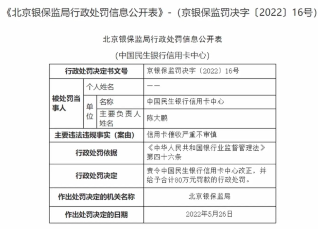 巨额罚款的背后,或许也有未整改收回情况下继续违规发放贷款的影子。2022年6月2日,中国民生银行信用卡中心因信用卡催收严重不审慎,被北京银保监局罚款80万元。按照条款规定,50万元是《银行业监督管理法》第四十六条的上限,民生银行被罚80万元,可见背后情节严重性。