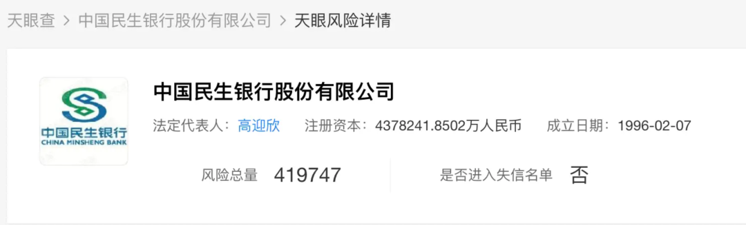 根据天眼查显示,民生银行的风险总量高达419747,暴露出了各种各样的问题。信息化的今天,银行做得好与不好,客户内心都有一杆称。民生银行忽视顾客,也更容易被顾客抛弃。在多元化的道路上,没有C端的支持,民生银行的没落似乎也在情理之中。
