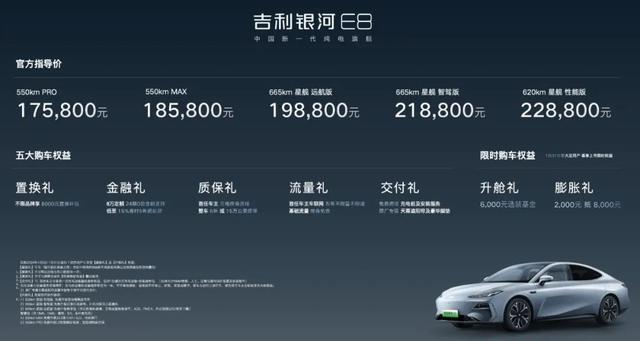 银河是吉利旗下新推出的新能源品牌序列,在推出L6和L7这两款插电混动轿车和插电混动SUV后,纯电银河E8再次锦上添花,除了动力切换纯电外,在售价上,银河E8上升到顶配的22.88万元,也被吉利认定为“中国新一代纯电旗舰”。