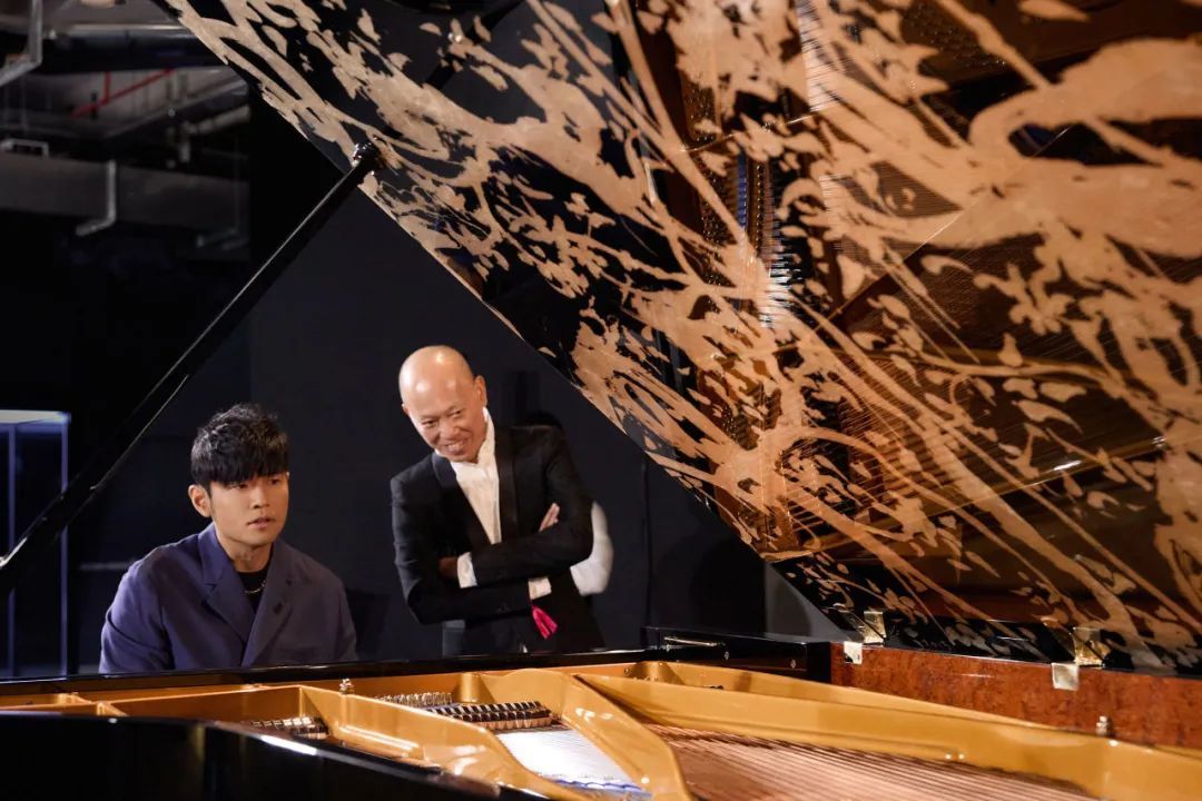 ▲策展人周杰伦(Jay Chou)与博莱斯勒(Blüthner)钢琴艺术作品《四季》创作艺术家郭承辉。《艺起“杰”作》VIP预展现场。摄影:张晋菩(Paul Zhang)