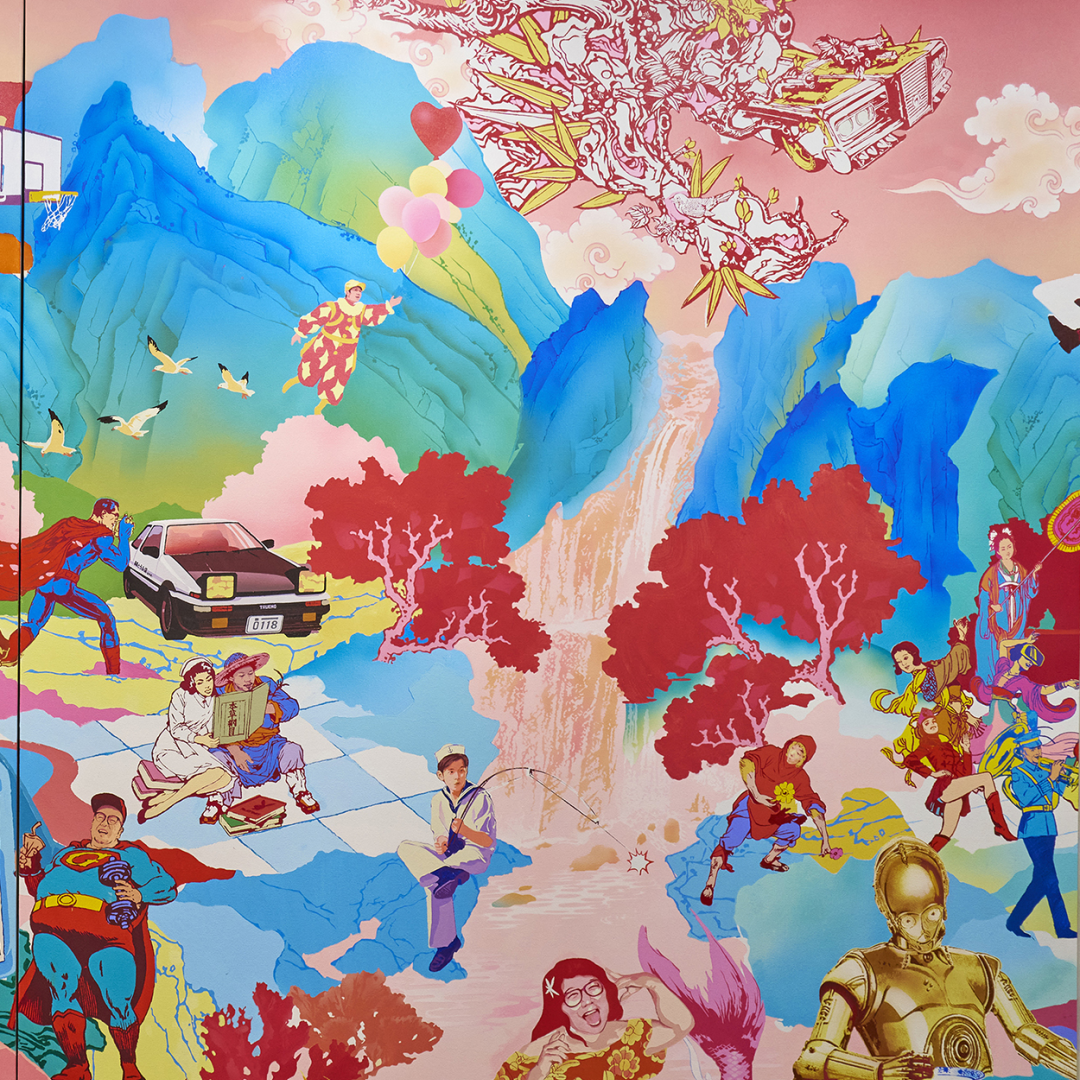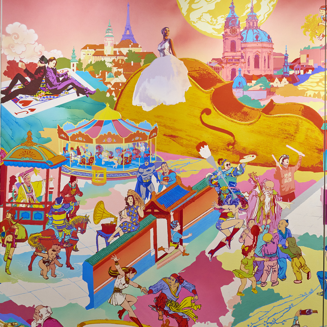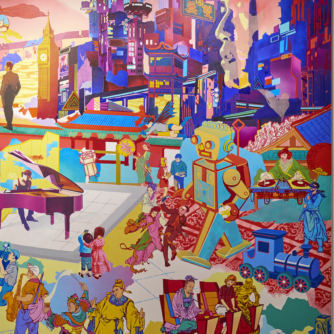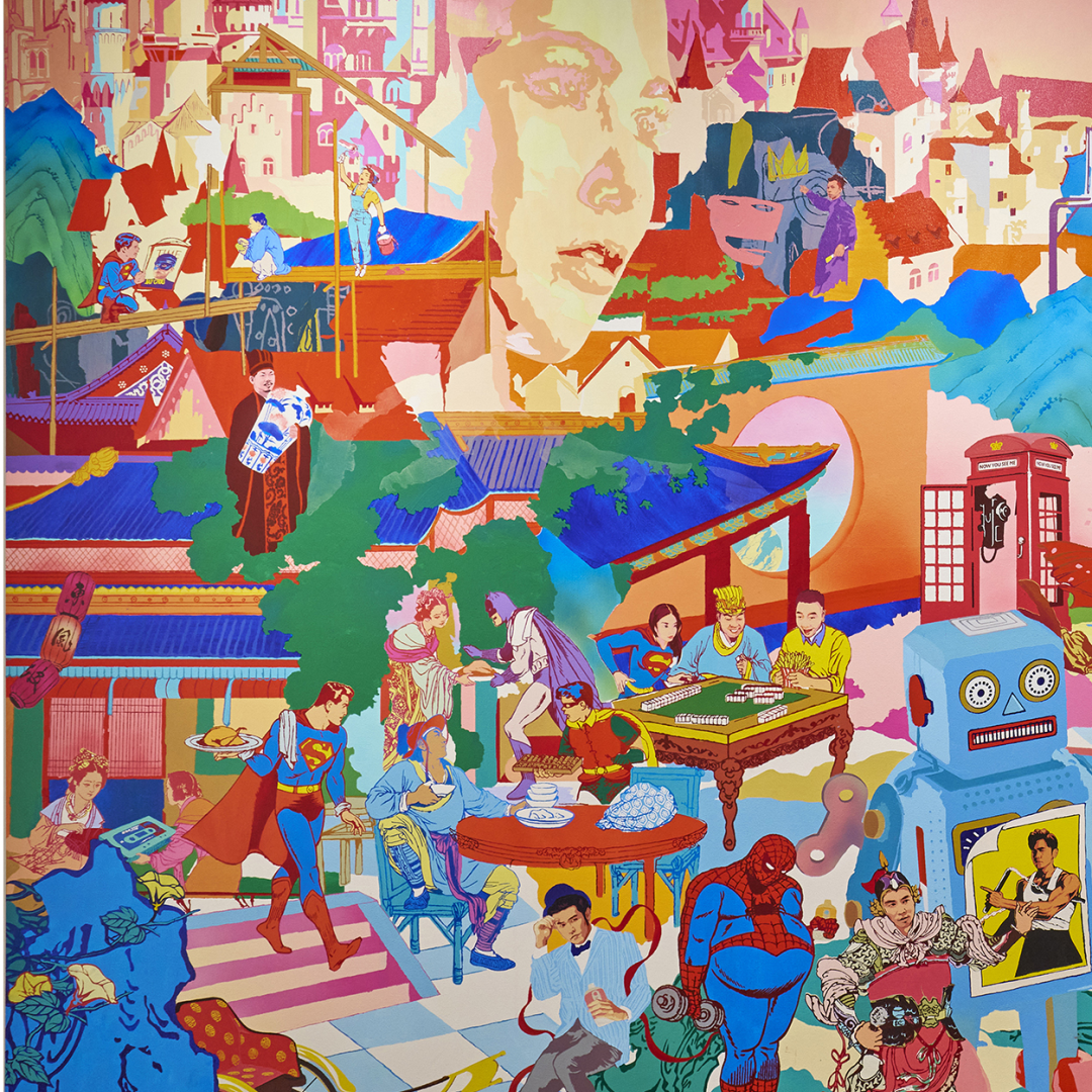 ▲滑动查看:蔡赟骅 《翻玩范特西》,2019 年,布面丙烯,800 x 250 厘米