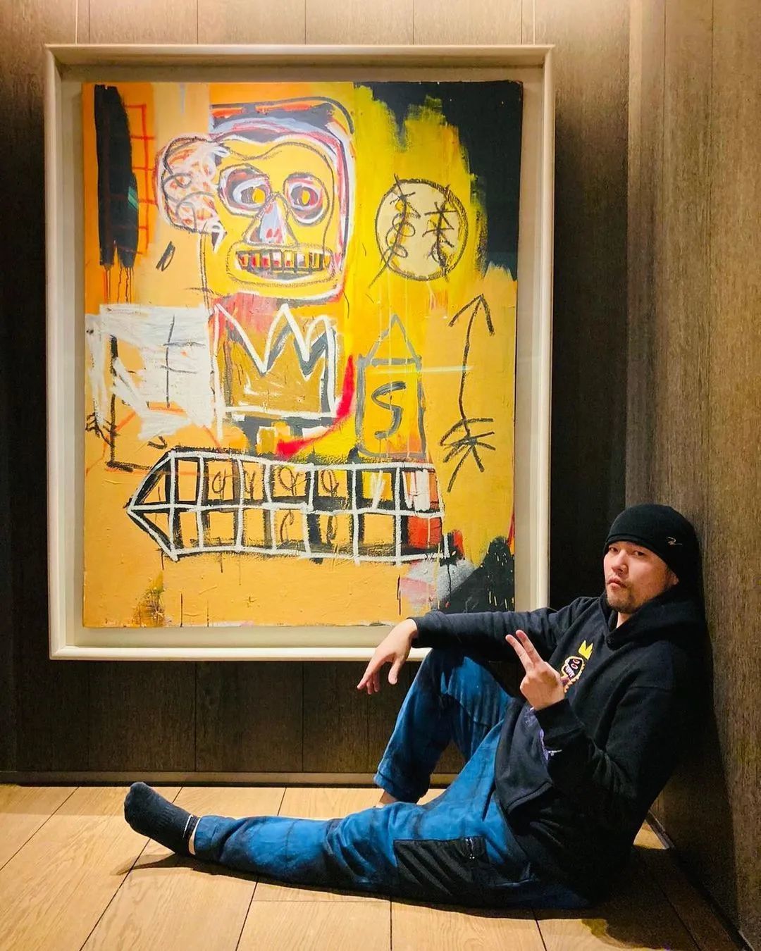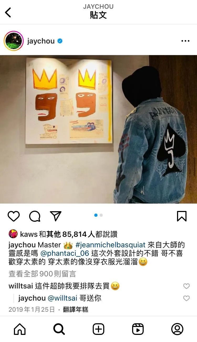 ▲周杰伦在巴斯奎特《无题》(橘色运动人像)画前留影,此幅画于2018年以逾2.6亿元台币拍出。(图/翻摄jaychou IG)
