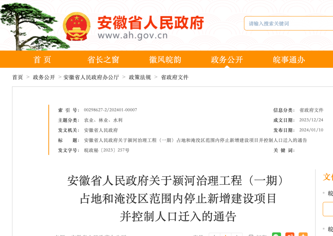 一、自本通告发布之日起至2027年12月31日,颍河治理工程(一期)占地和淹没区征地范围为停止新增建设项目并控制人口迁入区域(以下简称“控制区”)。控制区涉及:阜阳市界首市、太和县、颍上县、颍泉区、颍东区、颍州区的26个乡镇(街道)、54个村(社区)。