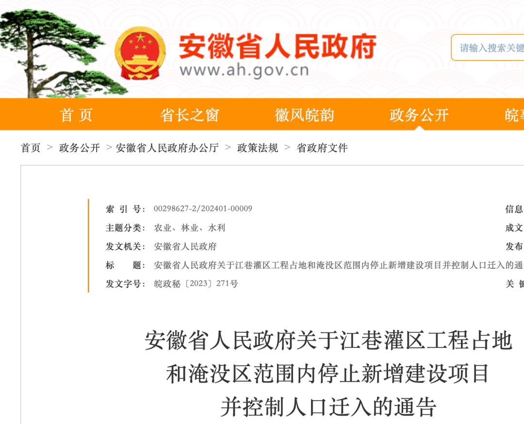 近日,安徽省人民政府发布通告,江巷灌区工程占地和淹没区范围内停止新增建设项目并控制人口迁入;