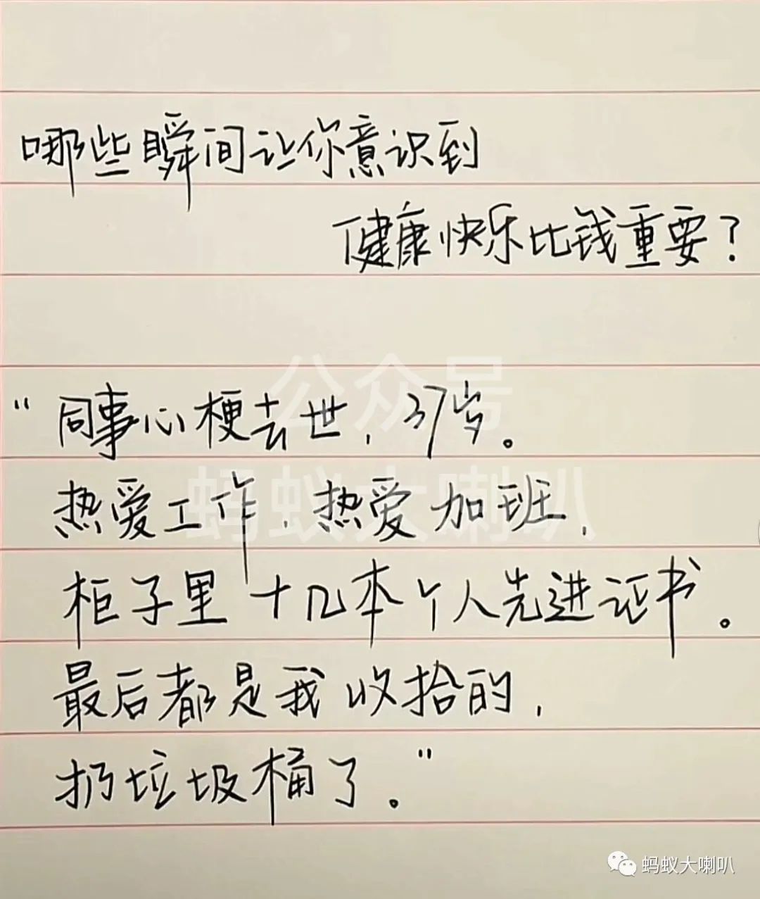 曾经看到过一位网友提问:“哪些瞬间让你意识到,健康快乐比钱重要?”当时在评论区看到别人述说着自己或者身边人的经历,虽然有些感触但并没有触及内心。直到亲身经历过好友突然的“猝死”,在整理他工作办公桌的遗物,然后把他的荣誉证书扔到垃圾桶的那一刻,内心深刻感触到:“生命真的很脆弱,学会寻找到工作与生活之间的平衡。”