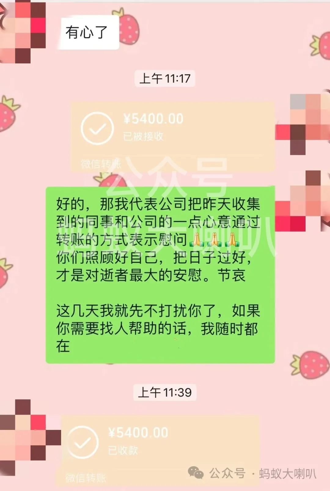 他在部门里年龄最大,我们都称呼他为“侯哥”。侯哥去世后,部门领导向公司争取到了慰问金,他的逝世对家庭造成了很大的伤害,家中就剩下媳妇独自抚养两个孩子,家庭本身也不太富裕。公司拿出3000元,部门同事匿名又募捐了2400元,总共5400元,让我代表公司转交给侯嫂。本来准备去吊唁,想来还是不去打扰最好,于是和侯嫂沟通之后,直接把钱通过微信转给她。