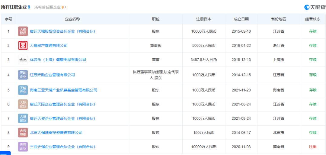 天眼查App显示,章泽天关联9家公司,8家为存续状态,多担任股东、董事长等职务,行业涉及文化艺术、资本市场服务等。章泽天3家公司与刘强东存在商业关联,其中宿迁天强股权投资合伙企业(有限合伙)注册资本达1亿元,刘强东、章泽天分别持股89.01%、9.99%。