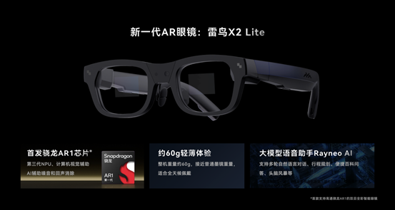 雷鸟X2 Lite搭载了高通骁龙AR1芯片,该芯片是高通首款面向轻薄型智能眼镜打造的专用处理器,大幅优化了功耗,并集成了高通第三代 NPU,在图像增强、语音交互、图片搜索等方面均有明显优势。