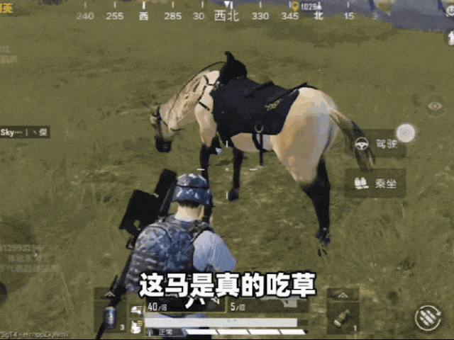 马的出现,给游戏增添了一丝魔幻色彩。而且和现代车辆一样,马也需要补充能量,只是给它补充能量的方法不是喂汽油,而是啃草。让许多玩家忍俊不禁的是,这马只吃绿草,不吃干草,许多玩家在等待马儿吃草的过程中,只能默默趴在地上做“伏地魔”,以防被其他玩家击成小盒。