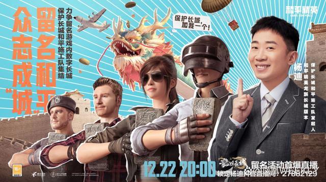 为了推广长城保护,《和平精英》也吸引来了明星大咖助力。2023年12月22日,《和平精英》特别邀请了杨迪出任《和平精英》龙跃长城新版本保护长城公益项目的“总工头”,通过直播的形式,邀请多位游戏头部主播,组建了“保护长城”和平施工队。