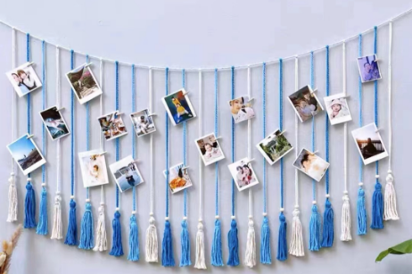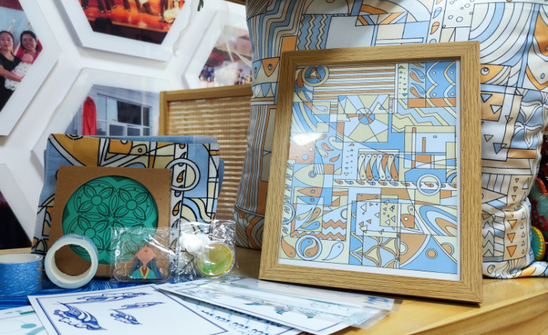 闲聊着走进工坊,入目是琳琅满目的扎染文创,布偶、抱枕、装饰画,俏皮而醒目。面前一张近四米长的桌上铺着她亲手染的蓝色茶席,上置茶碗、茶壶、茶托及石榴叶染的茶垫。墙边一排置物架上,摆放着小卷或蓝染的茶席方巾,像开满了一箱子的花。造型各异的针织玉兰在瓶子里舞蹈,一捧金黄的郁金香在窗前灿烂。