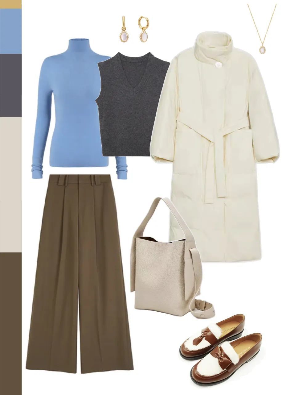 上衣我选了灰色马甲搭配蓝色打底衫,减少彩色的露出面积,整个人气质会显得更加沉稳。