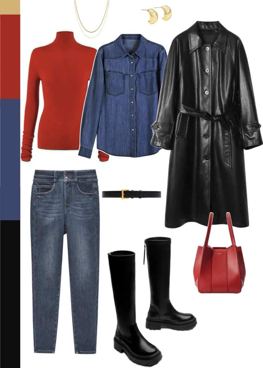 上半身叠穿了红色打底和牛仔衬衫,在面部小小地露出一截红色超级提气。