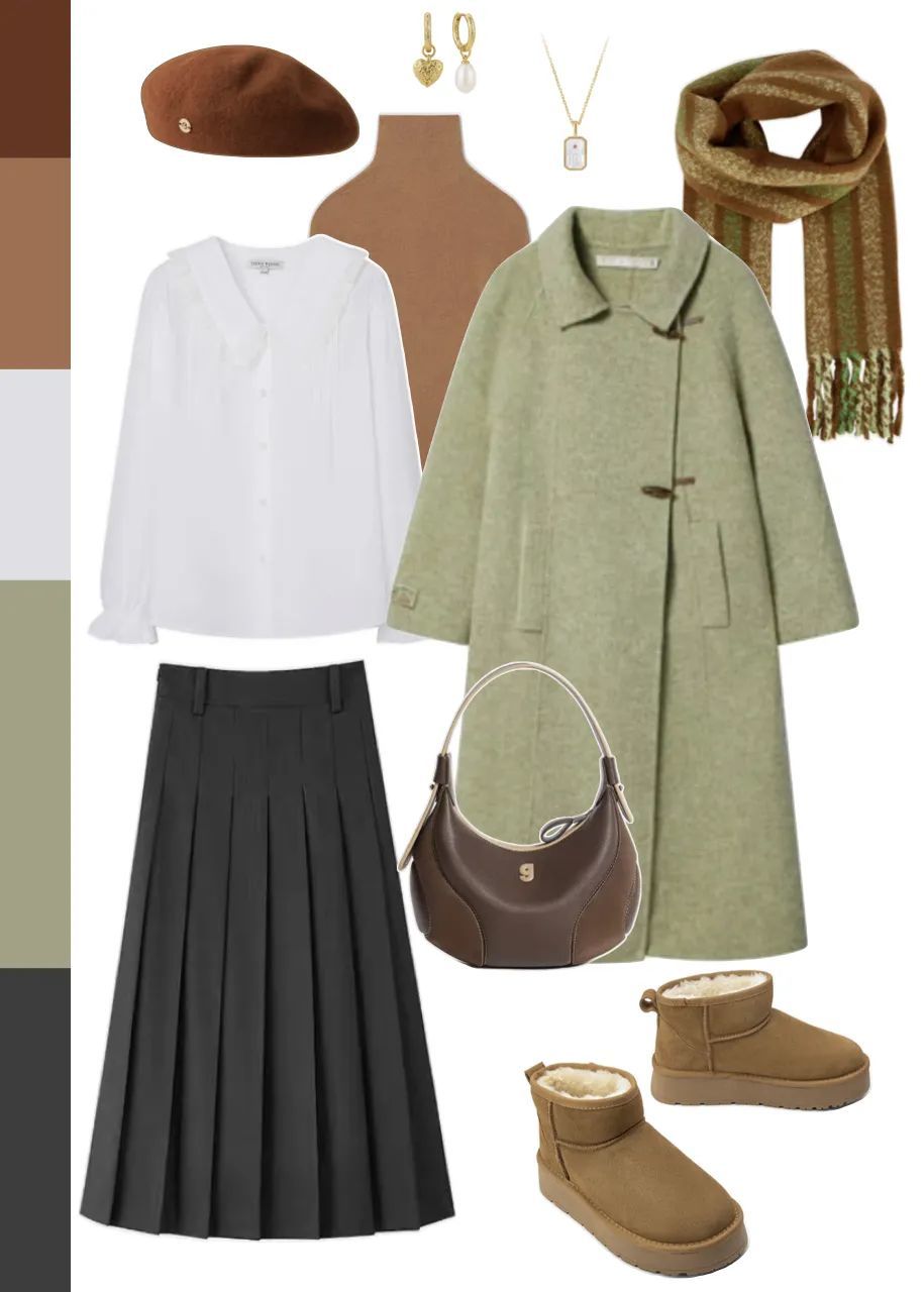 包包、帽子和围巾我都选了棕色系,风格更加温暖复古,和鞋子的颜色也能呼应上。
