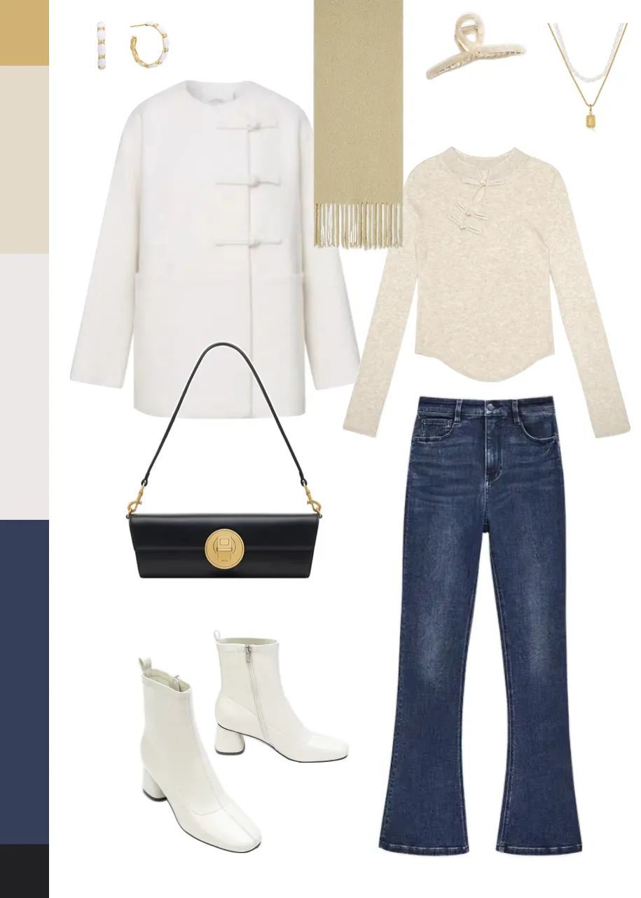 外套选了带盘扣的白色大衣,再用白色中跟靴子呼应,中式温婉大气的感觉就拿捏住了,华流果然是最棒的!