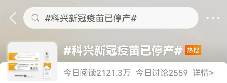 1月10日,一份名为“停发新冠项目绩效工资方案”的文件在网上传播,落款为北京科兴中维生物技术公司,其中提到公司新冠疫苗已全部停产且公司目前也无新冠疫苗产品销售。随即,“科兴新冠疫苗已停产”相关话题冲上各大热搜榜单。
